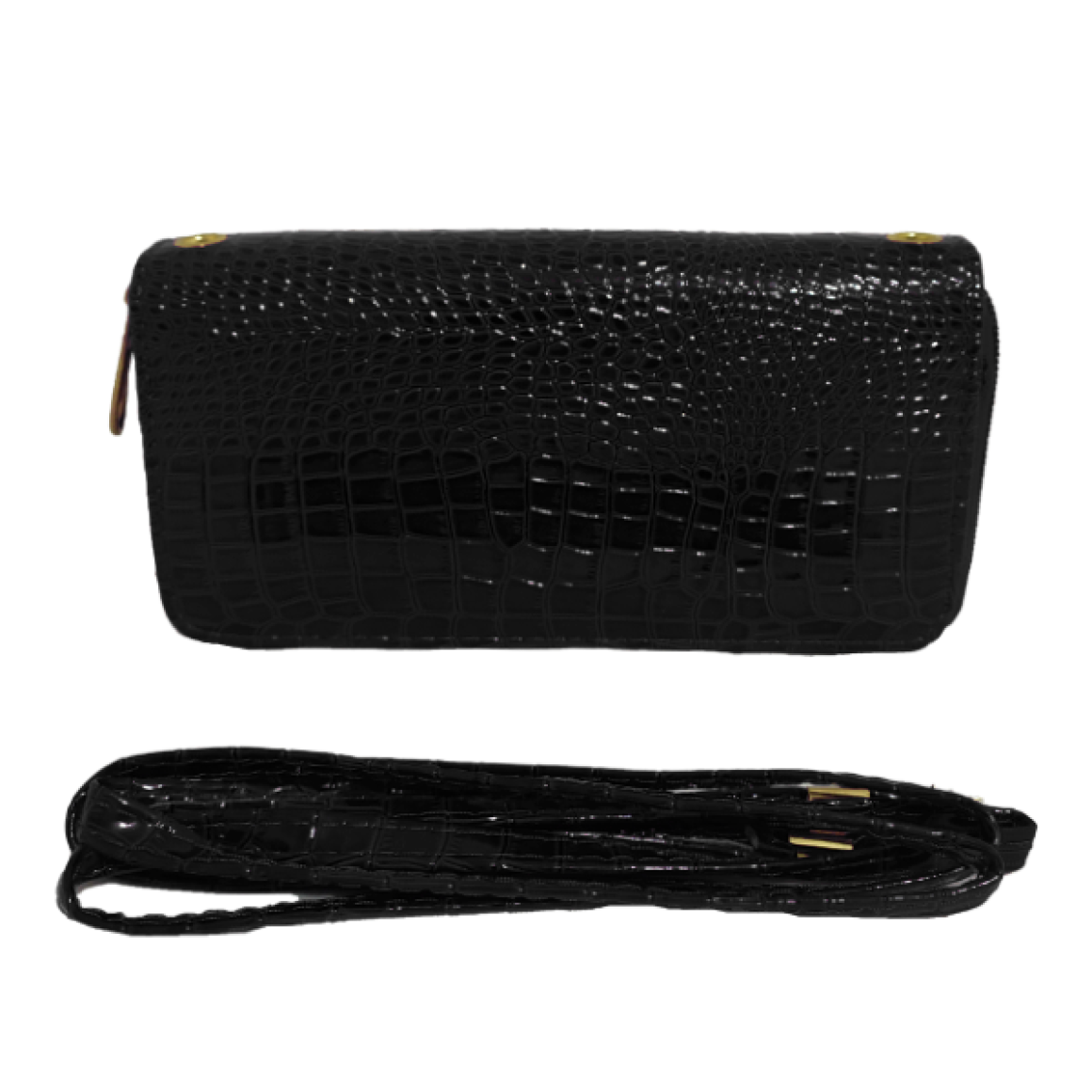 Carteira de verniz com várias divisórias vem com dois zíper e alça comprida para usar como bolsa.