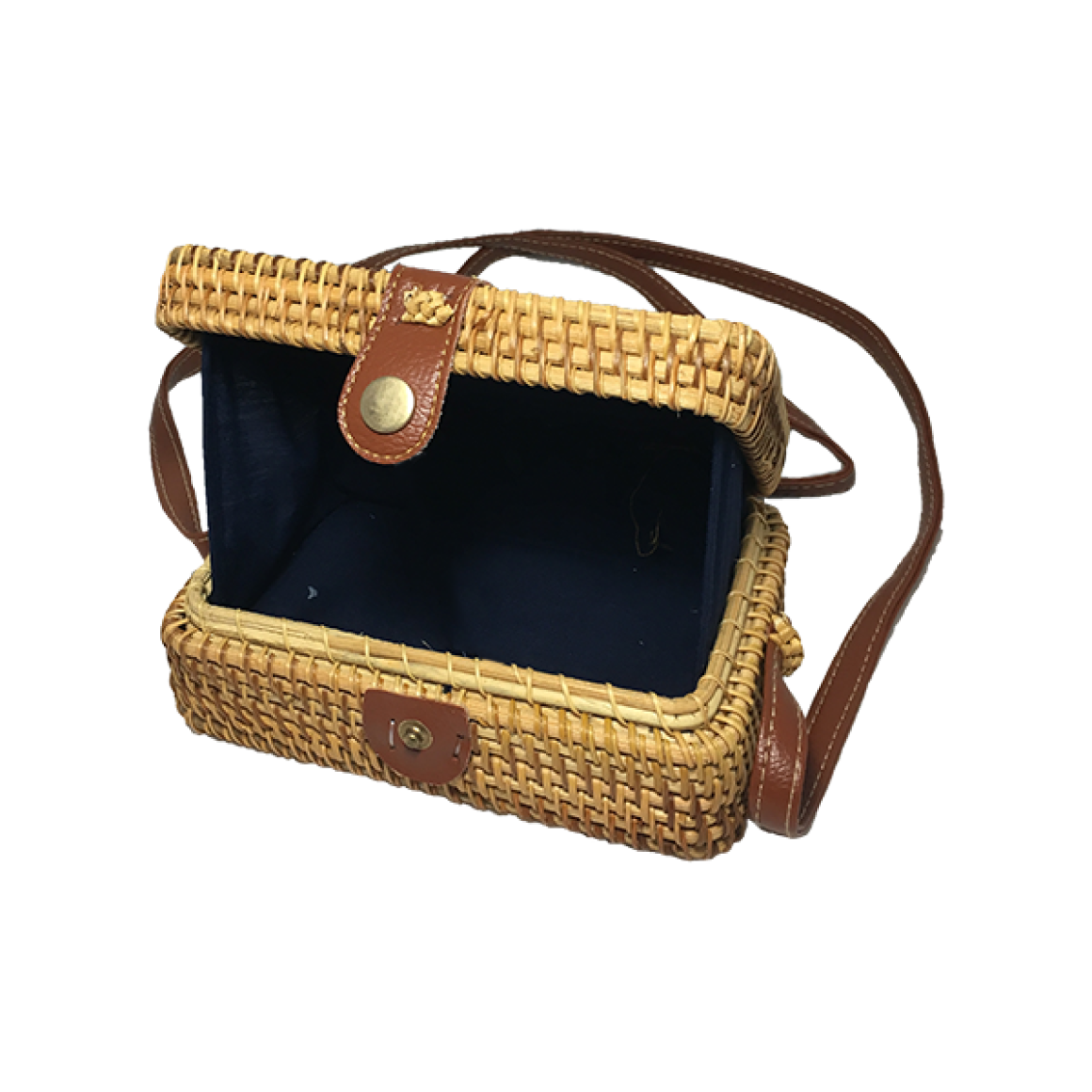 Trabalho artesanal em ratan e com fecho de pressão com couro sintético.